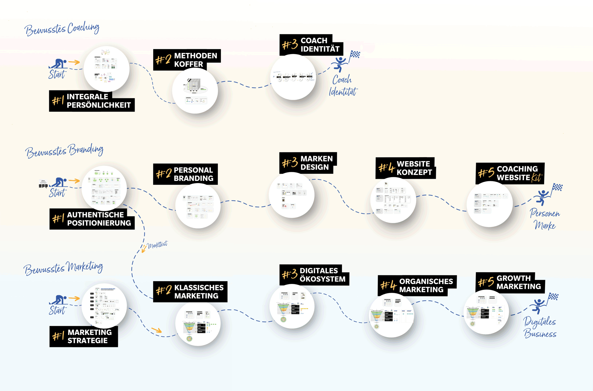 Kläre mit uns zu Beginn deiner Reise, welche Coach-Identität du hast. Bist du eher Coach, Mentor, Berater, Speaker, Autor, etc.? Welche Methoden solltest du erlernen und bist du schon gut gerüstet für den Schritt in die Selbstständigkeit – sowohl innerlich (Mindset, emotionale Blockaden) also auch äußerlich (Gründung, Steuern, Versicherungen, etc.)?